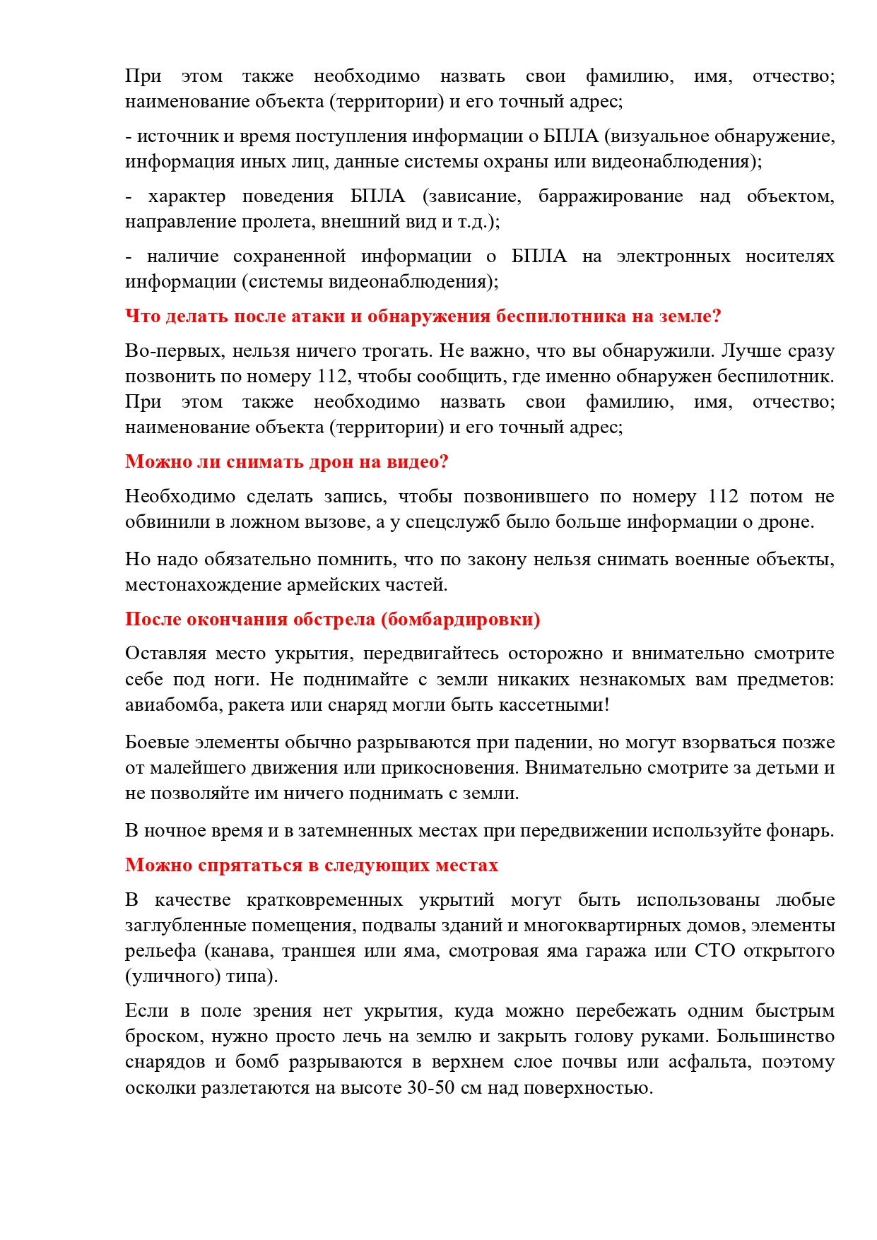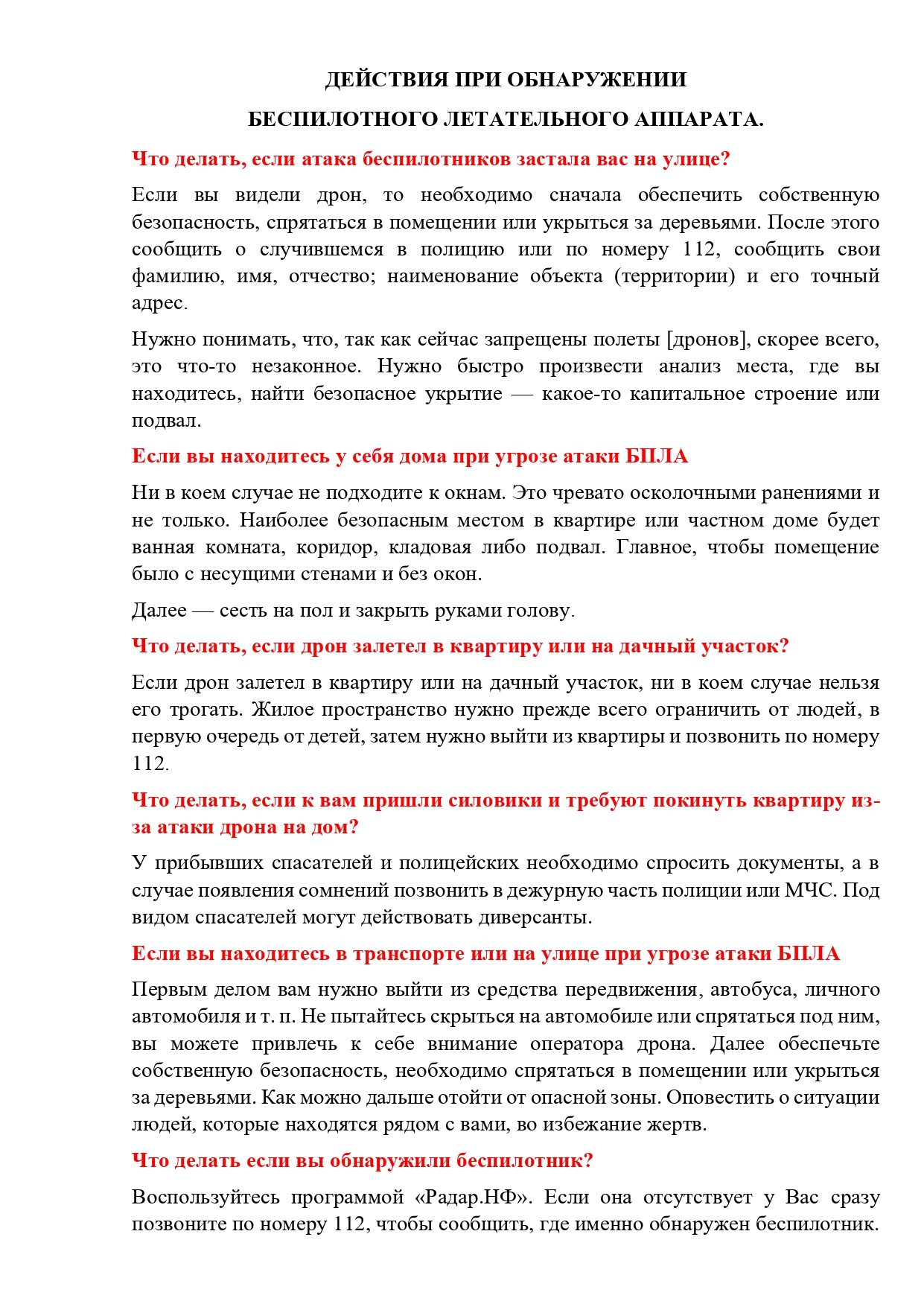 Памятка населению в случае выявления нахождения беспилотных воздушных судов