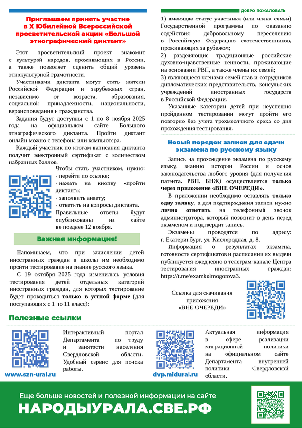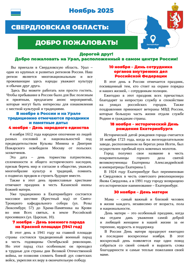Бюллетень для иностранных граждан на ноябрь 2025 года, в котором содержатся сведения о государственных праздниках, памятных датах и полезная информация.