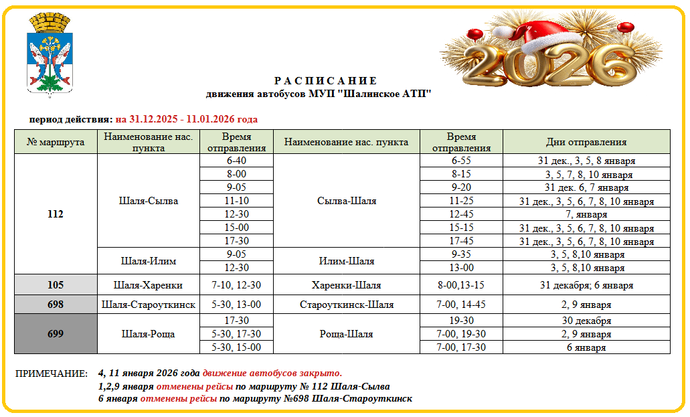 Расписание движения автобусов в праздничные дни с 31.12.2025 по 11.01.2026 года.
